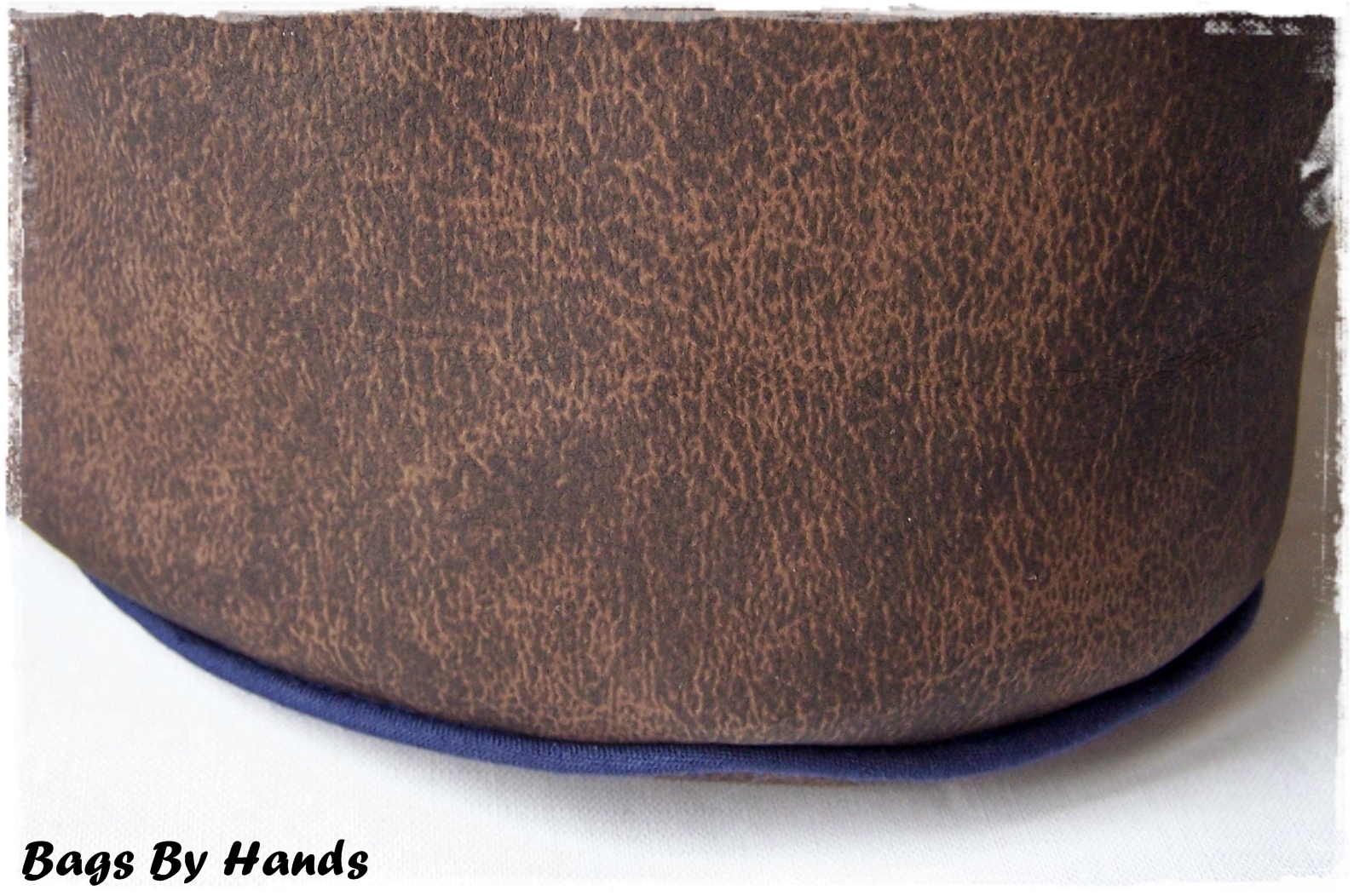 This bucket is made with a brown faux leather fabric and a striped cotton for the lining.